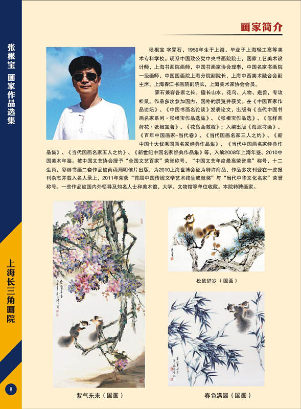张根宝.字霁石,1959年生于上海,毕业于上海轻工高等美术专科学校。现系国家工艺美术设计师,中国美术家协会会员(CIAA),上海书画院画师,中国书画家协会理事,中国名家书画院一级画师,上海春江书画院副院长,上海美术家协会海墨中国画工作委员会会员,日本洗心书画院院士。 霁石兼容各家之长,擅长山水、花鸟、走兽,专攻松鼠.有海上松鼠王之称。作品多次参加全国及部分省市的展览。作品参加第三届、第四届上海国际艺术博览会。2000年上海教育电视台诗与画节目专题报道。2001年松鼠图得国粹奖,同年《中国百家作品论坛》发表论文。2002年《中国书画名论谈》发表论文,同年在上海民主党派大厦棠柏艺苑举办个人画展。2003年由上海人民美术出版社出版的《当代中国书画名家系列•张根宝作品选集》同年作品获得海内外书画大赛金奖。2004年作品被选送法国参加“中法文化年”展览,同年在日本举办画展。2005年在澳门举办画展,同年作品在“走进新加坡——中国书画家精品展”中获得金奖、获“中国书画艺术精品工程奖”。2006年由古吴轩出版社出版的《张根宝作品选》;《海派书画》发表作品。2007年“五福临门松鼠图”拍出五万元捐赠上海慈善基金会。2008年作品被中国美术家协会“和谐家园”展藏,同年作品获中国美术家协会举办的“2008红星杯全国书画大赛”优秀奖;被中国文艺协会授予“全国文艺百家”荣誉称号,同年在上海举办个人画展,上海新闻综合频道进行报道。2009年在上海纪实频道播出“张根宝画牛”。作品多次刊登在新民晚报、劳动报、城市导报、解放日报、美术报、书与画及朵云和东方航空等一些报刊杂志,并载入名人录上。一些作品被国内外领导及知名人士和单位收藏。